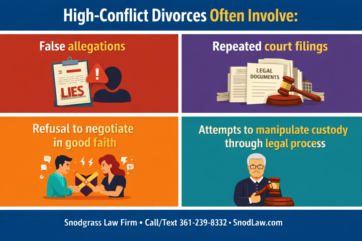 We help clients protect their rights when divorce becomes a legal fight, not just a filing. If you would like our assistance, contact Corpus Christi Divorce Attorney R.F. Michael Snodgrass at info@snodlaw.com or call or text us at 361-239-8332.